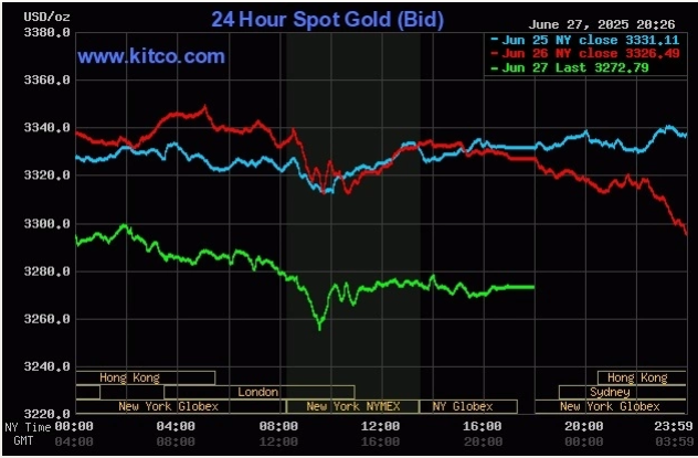 Chốt phiên giao dịch ngày 27/6, giá vàng thế giới giao ngay giảm 53 USD xuống 3.272 USD một ounce. Đây là mức thấp nhất một tháng. Tổng cộng cả tuần, giá đã giảm 2,8%, ghi nhận tuần thứ hai liên tiếp đi xuống.