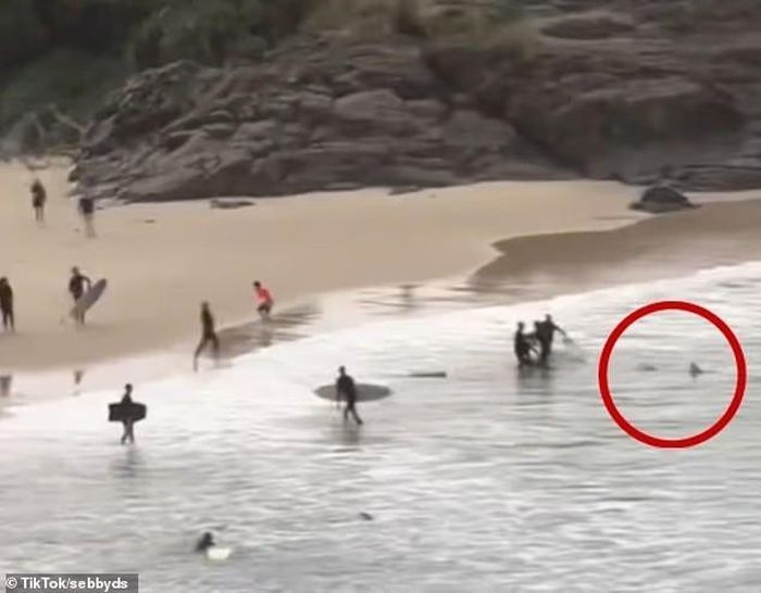 Hình ảnh trong video cho thấy con cá mập dài khoảng 2 mét vẫn lượn lờ gần bờ biển khi một nhóm người đang kéo nạn nhân lên khỏi mặt nước.