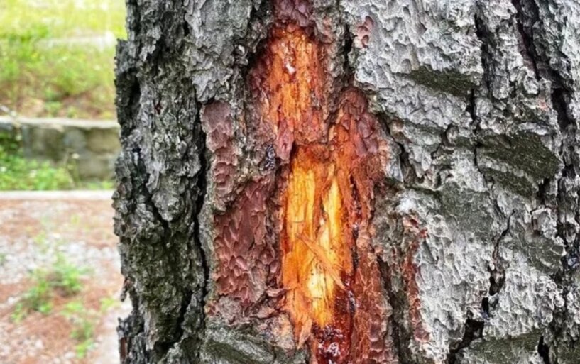 Thân cây thông già bị khoan lỗ, đổ dung dịch lạ vào bên trong để "đầu độc".