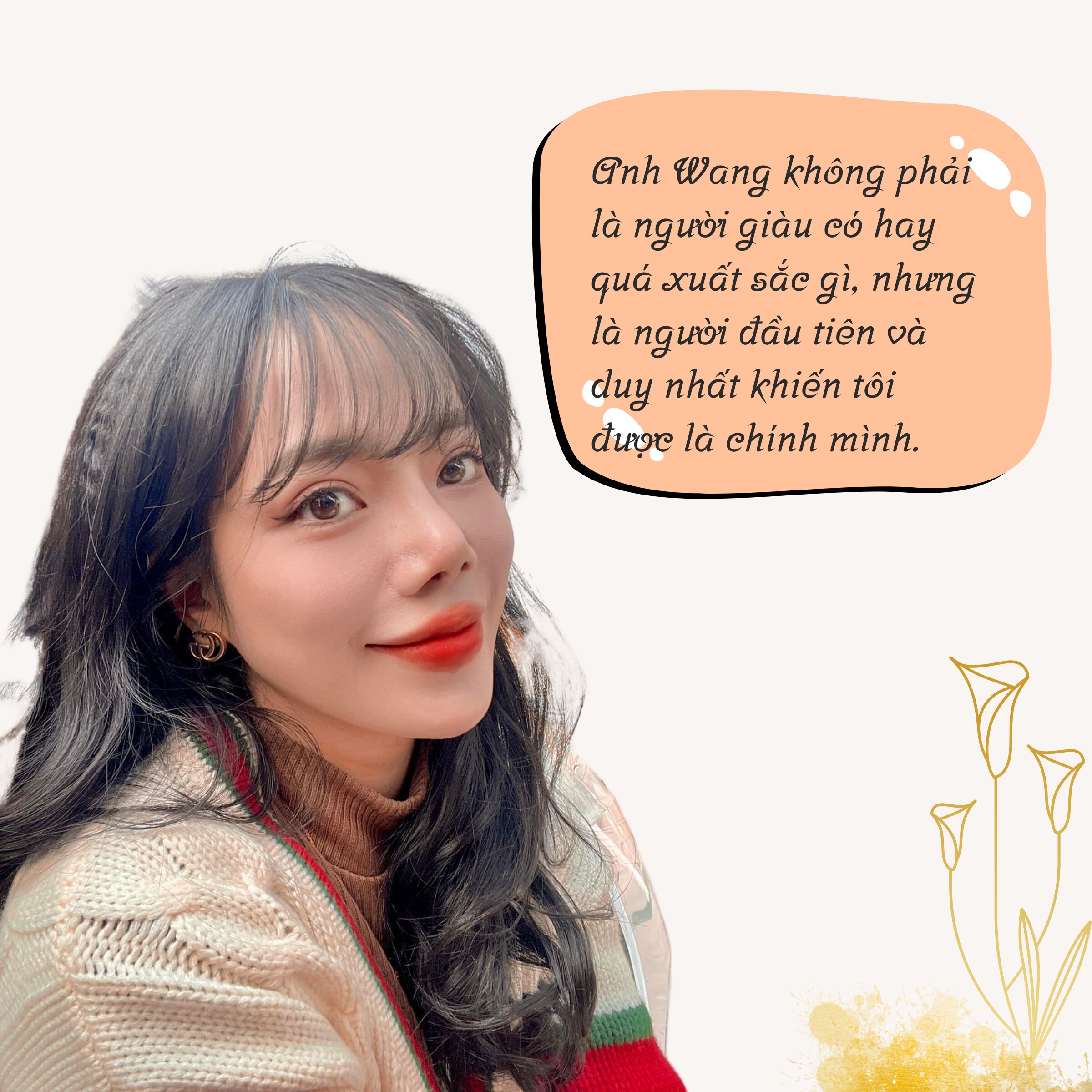 Anh Wang không phải là người giàu có hay quá xuất sắc gì, nhưng anh là người đầu tiên và duy nhất khiến tôi được là chính mình. Ở bên anh, tôi không cần phải cố gắng tỏ ra hoàn hảo. Dù tôi mặc váy áo lộng lẫy hay chỉ đơn giản là bộ đồ ngủ, dù tôi trang điểm kỹ càng hay mặt mộc nhợt nhạt vì vội đi học, đi làm, anh vẫn luôn nhìn tôi bằng ánh mắt đầy yêu thương và trân trọng.