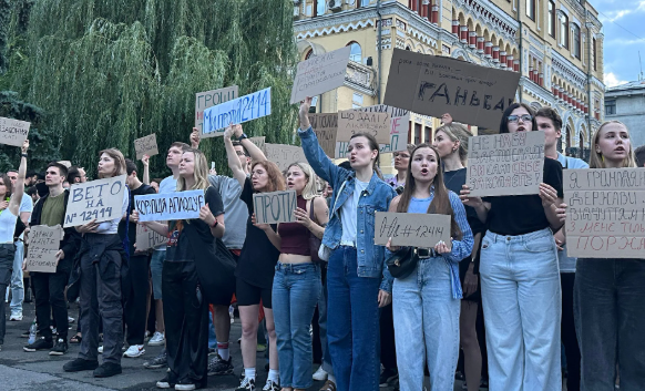 Đám đông người biểu tình mang theo các biểu ngữ như “Chào mừng đến nước Nga” và “Azov đâu rồi?” – ám chỉ Lữ đoàn Azov thuộc Vệ binh Quốc gia Ukraine. Họ cho rằng chính phủ đang đi theo con đường tập quyền, trái ngược với các giá trị của châu Âu. Một số người cáo buộc ông Andriy Yermak, Chánh văn phòng Tổng thống, là người đứng sau đạo luật gây tranh cãi.