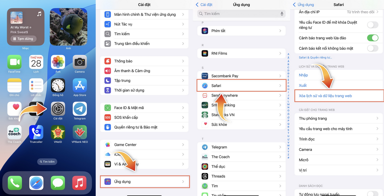 Lúc này, cách tốt nhất để tăng tốc iPhone là xóa bộ nhớ đệm trình duyệt. Để thực hiện việc này trong Safari, hãy mở Cài đặt > Ứng dụng > Safari > Xóa lịch sử và dữ liệu trang web. Từ cửa sổ bật lên, chọn Xóa lịch sử và dữ liệu để xác nhận.