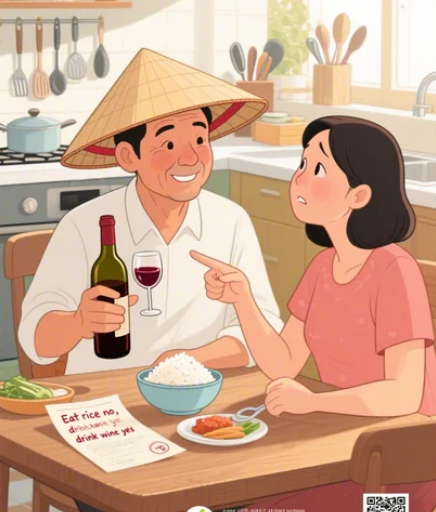 Hôm nay, anh ăn cơm không thấy ngon miệng tí nào, nên anh phải uống rượu để ăn cho ngon! 😅