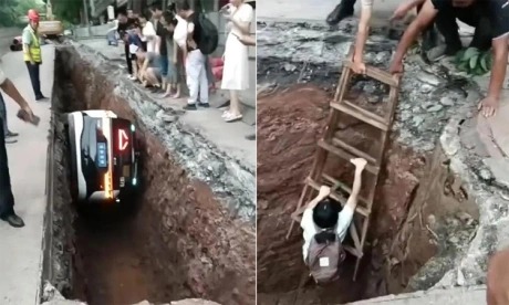 Chiều ngày 6/8, một chiếc robotaxi rơi xuống rãnh thi công ở quận Vĩnh Xuyên, thành phố Trùng Khánh. Chiếc xe bị kẹt trong hố, nữ hành khách được người dân bắc thang để trèo lên trên, theo Sohu.