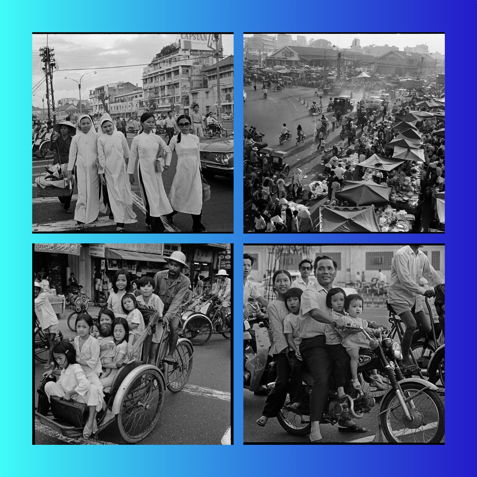 Một gia đình năm người chở nhau trên chiếc Honda 67 bé nhỏ, gương mặt ai cũng rạng rỡ. Không kém phần ấn tượng là chiếc xích lô chở đầy ắp trẻ em, những khuôn mặt hồn nhiên xen chút tò mò. Đây là hình ảnh quen thuộc của Sài Gòn thời ấy, khi luật giao thông chưa khắt khe, và xích lô, xe máy là phương tiện “đa năng” của mọi gia đình.