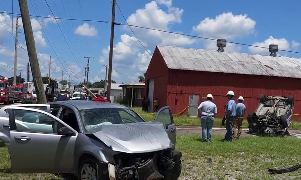 Hiện trường tai nạn hôm 16/7, với chiếc xe cảnh sát lật ngửa giữa đường, trong khi xe của tài xế khác nằm trên lề đường, cạnh một cột điện bị đâm nghiêng. Ảnh: WCBI
