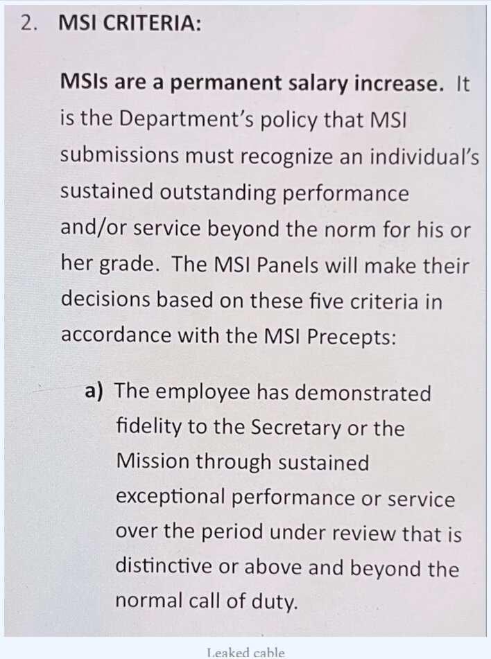 Tấm điện liệt kê năm tiêu chí để được tăng lương theo MSI, tiêu chí đầu tiên tất nhiên là lòng trung thành với Ngoại trưởng.
