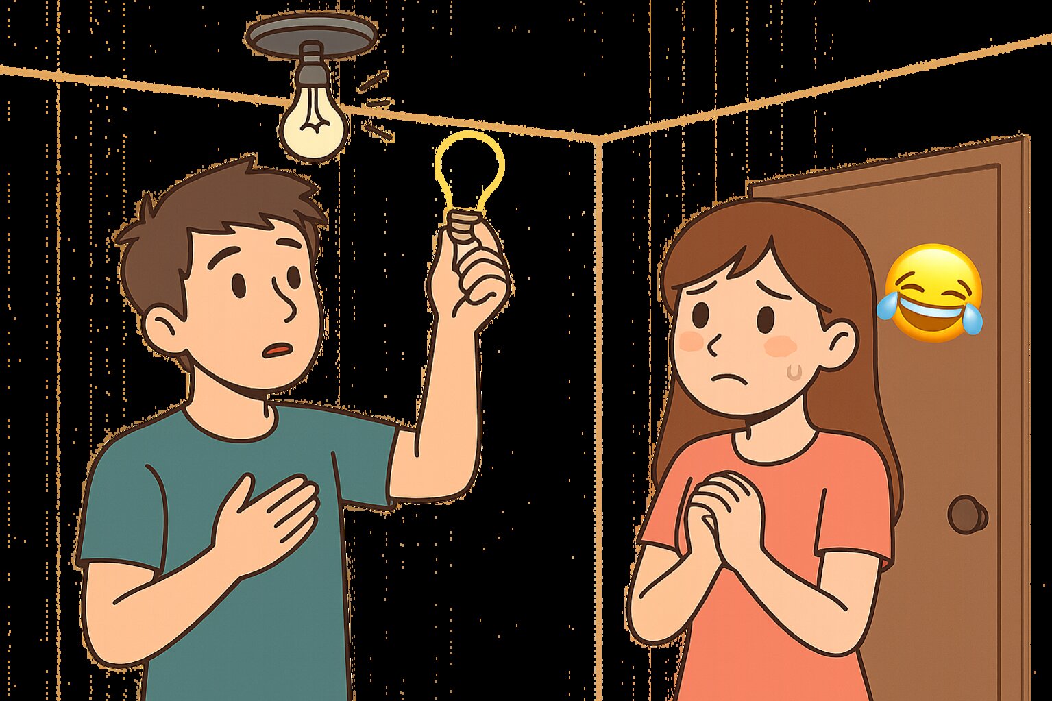 Một hôm, bóng đèn trong phòng cô gái bị hỏng. Cô nhờ anh sang thay hộ. Chàng trai mừng rỡ, nghĩ: “Cơ hội tới rồi đây!”