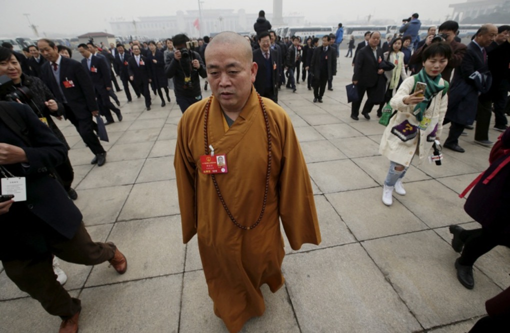 Trụ trì Shi Yongxin đi về phía Đại lễ đường tham dự phiên họp ở Bắc Kinh, Trung Quốc. Ảnh: Think China