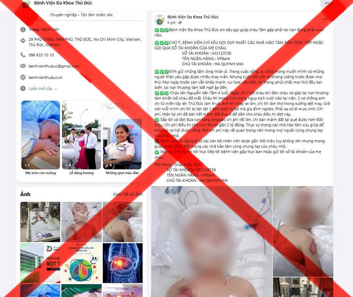 Đối tượng lạ giả mạo fanpage của Bệnh viện Đa khoa Thủ Đức, TP.HCM kèm theo hình ảnh bệnh nhi nguy kịch để kêu gọi quyên góp từ thiện.
