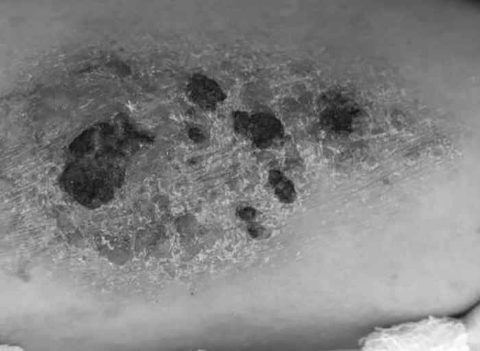 Bệnh nhân đến Bệnh viện Da liễu TPHCM khám. Các bác sĩ cho biết đây là tình trạng viêm da nhiễm trùng. Sau một tuần điều trị bằng kháng sinh, kháng viêm, vùng thương tổn mới khô và giảm đau rát.