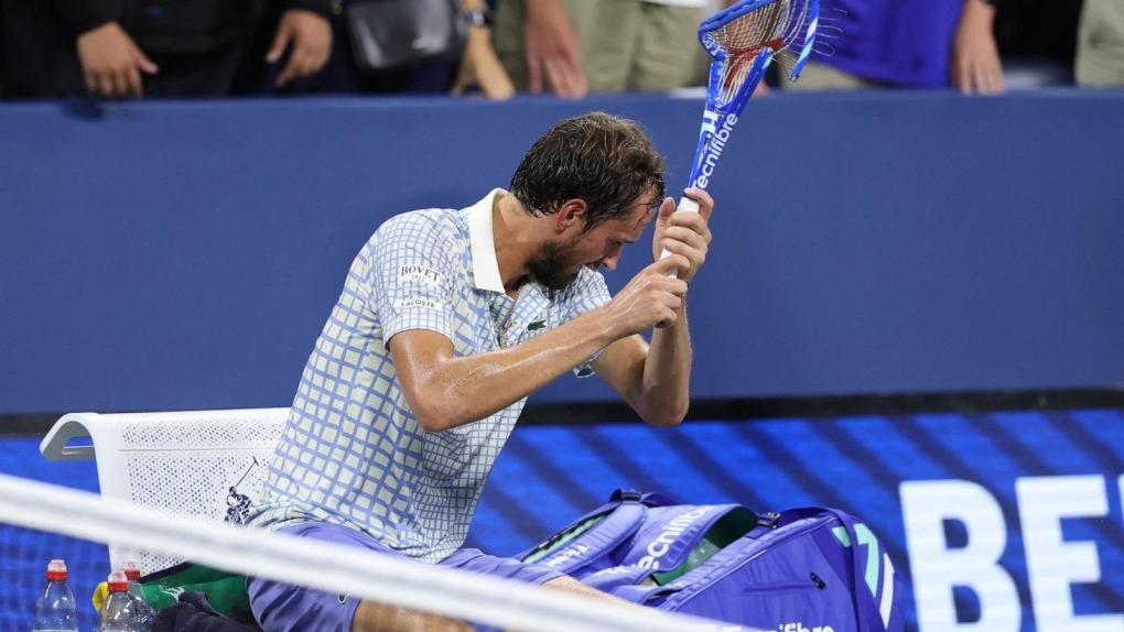Medvedev đập nát vợt sau khi thua Bonzi ở vòng một Mỹ Mở rộng, trên sân Arthur Ashe, New York tối 24/8. Ảnh: Reuters