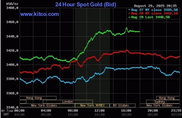 Chốt phiên giao dịch 29/8, giá vàng thế giới giao ngay tăng gần 30 USD lên 3.446 USD một ounce. Đây là mức cao nhất kể từ phiên 17/7. Tổng cộng cả tháng, giá vàng tăng 4,7% - mạnh nhất kể từ tháng 4.
