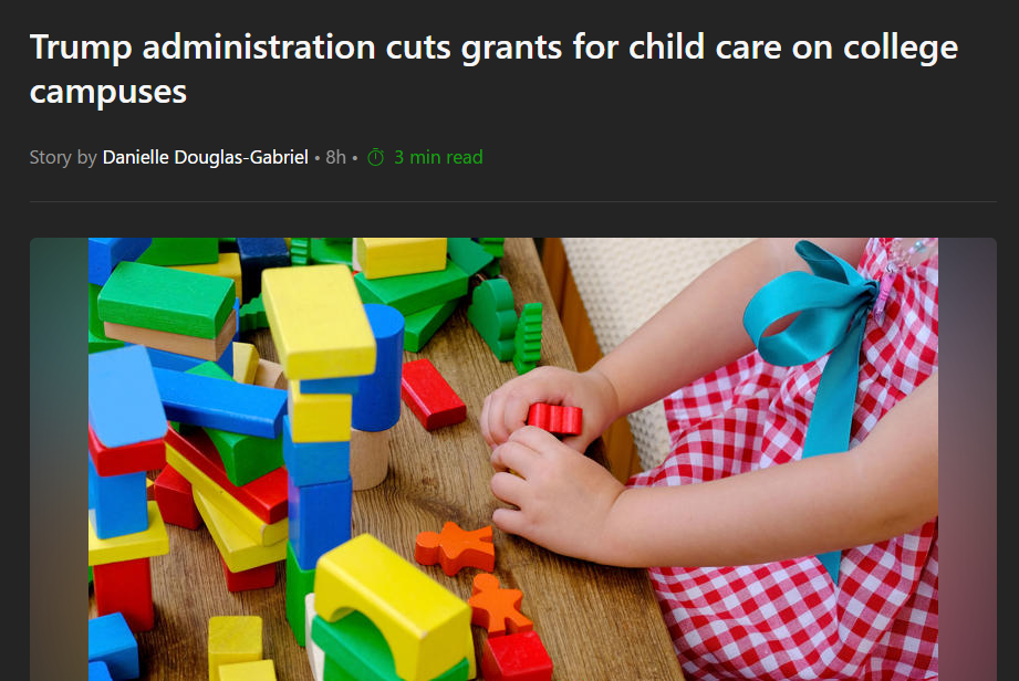 Bộ Giáo dục đã cắt giảm tài trợ cho dịch vụ chăm sóc trẻ em tại khuôn viên trường tại hơn một chục trường đại học, cáo buộc các trường này xung đột với chính sách của chính quyền Trump bằng cách dạy trẻ nhỏ về giới tính và chủng tộc hoặc ưu tiên sự đa dạng trong tuyển dụng.