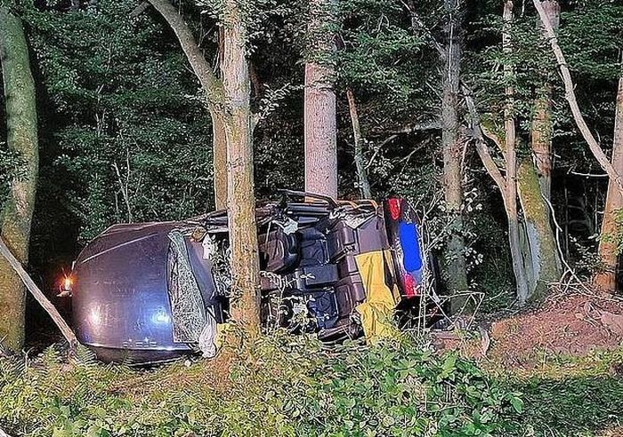 Chiếc ô tô mang biển số Anh dường như đã lao ra khỏi đường và đâm vào những cái cây cách đó khoảng 30 mét.