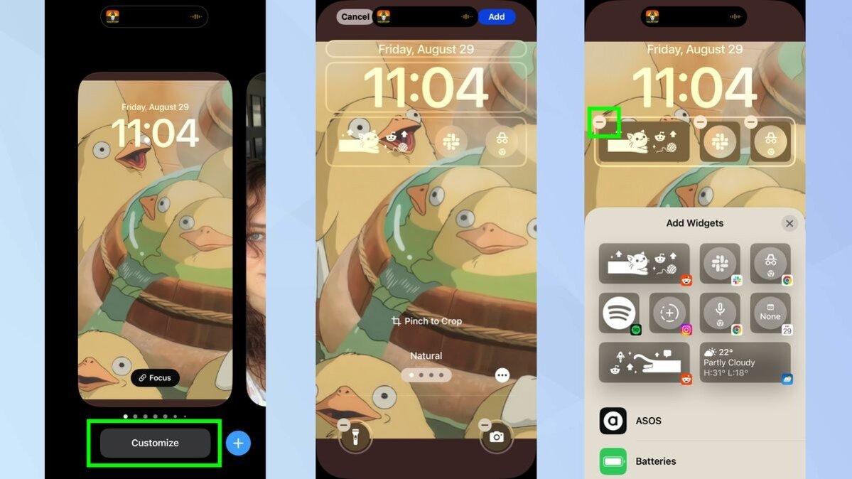 Nếu bạn muốn giữ hình nền hiện tại nhưng xóa widget, hãy nhấn và giữ màn hình khóa, sau đó chạm vào Tùy chỉnh, chọn Màn hình Khóa, chạm vào khu vực widget, và nhấn nút dấu trừ (-) trên mỗi widget để xóa chúng.