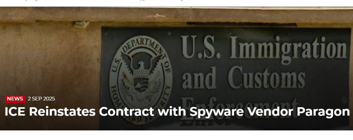 Cơ quan Di trú đã ký một thỏa thuận trị giá 2 triệu đô la vào tháng 9 năm ngoái cho phần mềm Paragon, phần mềm bị cáo buộc đã được sử dụng để nhắm mục tiêu vào các nhà hoạt động và nhà báo ở châu Âu, nhưng hợp đồng đã bị ảnh hưởng bởi lệnh ngừng hoạt động ngay sau đó.