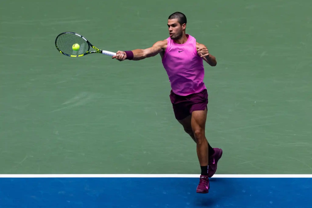 Alcaraz trong trận gặp Lehecka ở tứ kết Mỹ Mở rộng, trên sân Arthur Ashe, New York hôm 2/9. Ảnh: Reuters