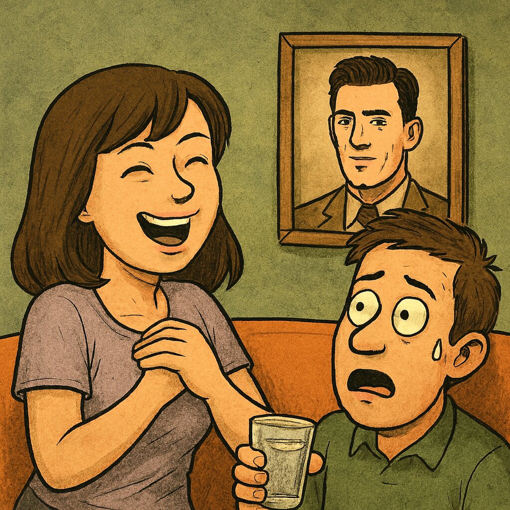 Cặp đôi yêu nhau đã lâu, tình cảm mặn nồng đến độ sắp tính chuyện trăm năm. Một hôm, cô gái mời bạn trai về nhà chơi. Trong lúc ngồi trò chuyện, anh chàng tình cờ nhìn thấy một bức ảnh treo trên tường – một người đàn ông cực kỳ tuấn tú, gương mặt góc cạnh, ánh mắt hút hồn.