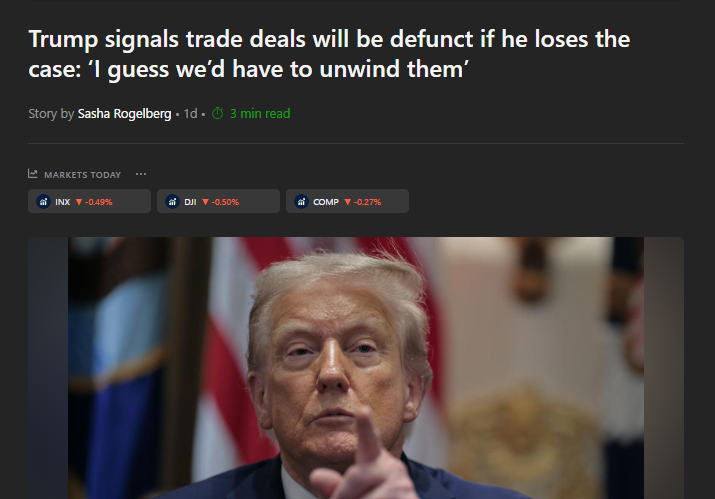 Theo Brett House, giáo sư thực hành chuyên môn tại Trường Kinh doanh Columbia, việc Trump ám chỉ sẽ chấm dứt các mối quan hệ thương mại của mình trong trường hợp thuế quan bị bãi bỏ là một lời nói suông bởi vì các thỏa thuận mà ông đã ký kết không phải là những thỏa thuận ràng buộc về mặt pháp lý.