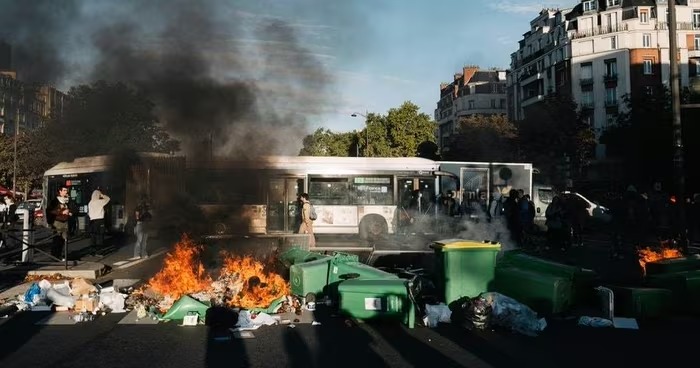 Người biểu tình đốt cháy xe buýt ở Pháp. Ảnh: CBS.