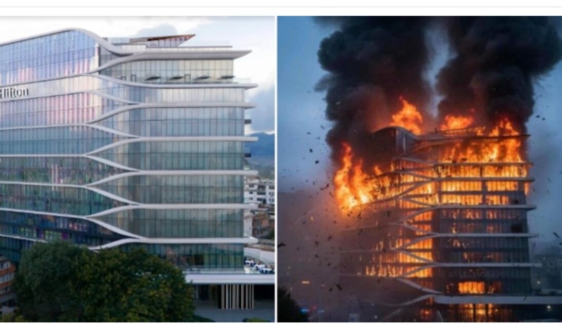 Hình ảnh trên mạng xã hội về việc khách sạn Hilton trước và sau bị thiêu rụi một mặt.