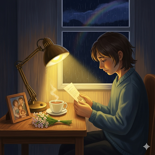Ngày chị rời xa, trời cũng đổ mưa. Tôi chạy từ bệnh viện về nhà, ôm lá thư trong tay mà không thấy đường phía trước. Giọt mưa nặng hạt hòa lẫn nước mắt, làm nhòe cả nét chữ vốn đã run run. Tôi tự hỏi, có phải chị đã biết trước khoảnh khắc này, nên mới chọn “mưa” và “cầu vồng” để nhắn nhủ với tôi?