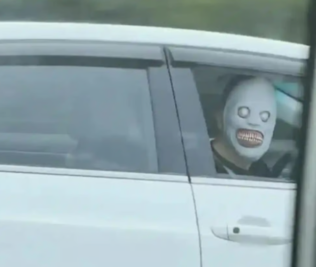 Sự việc xảy ra vào ngày 24/8. Theo đoạn video được hành khách trên một chiếc xe chạy cùng chiều ghi lại, người đàn ông ngồi trong xe phía trước bất ngờ hạ cửa kính, quay sang nh́n sang chiếc xe bên cạnh với chiếc mặt nạ đáng sợ che kín gương mặt.