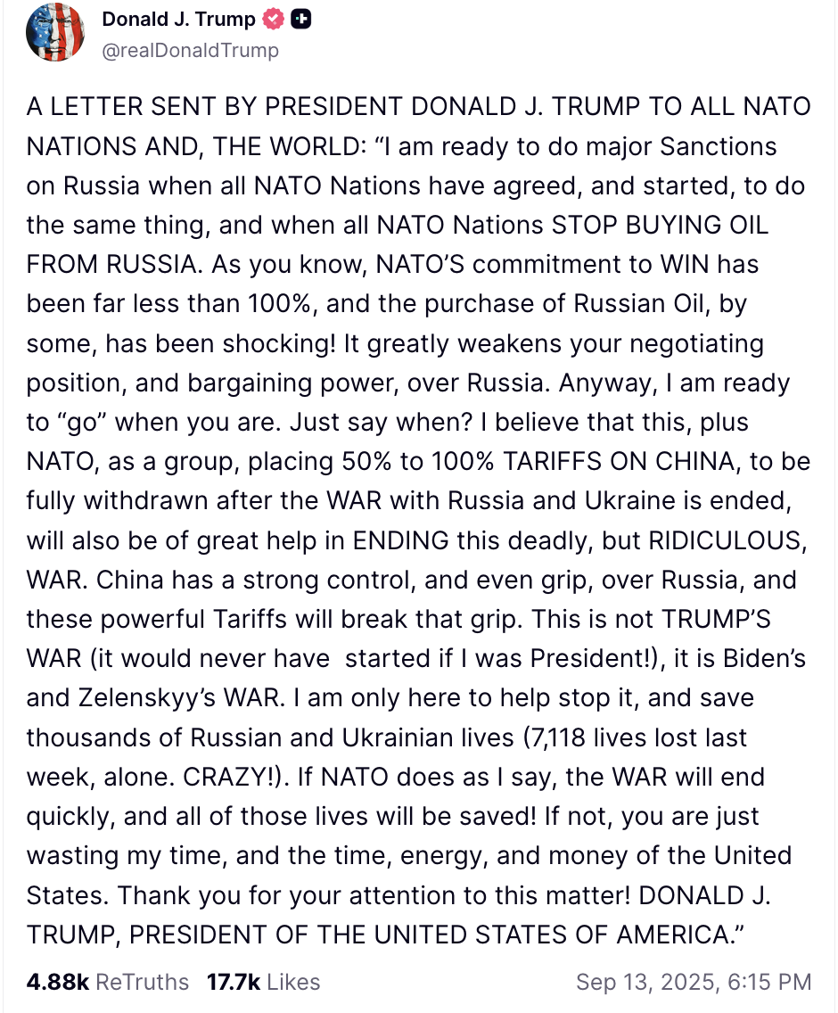 Trong bài đăng trên mạng xã hội Truth Social ngày 13/9/2025, Tổng thống Mỹ Donald Trump đã yêu cầu các thành viên NATO ngừng mua dầu của Liên bang Nga và ủng hộ việc áp thuế cao đối với Trung Quốc. Ảnh chụp màn hình tài khoản mạng xh Truth Social của Tổng thống Mỹ Donald Trump