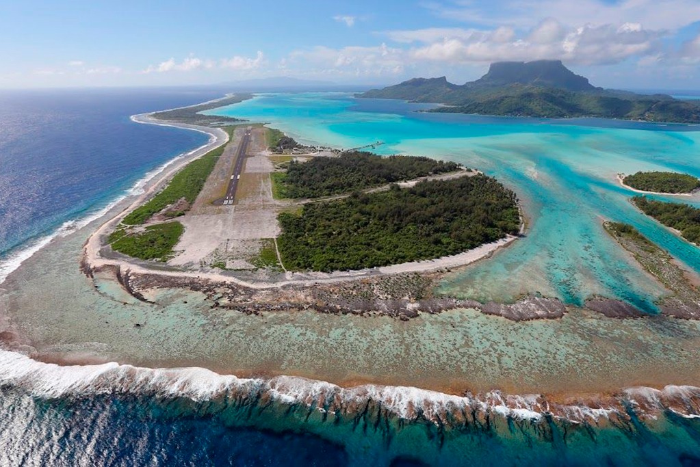 Sân bay Bora Bora, xây dựng từ Thế chiến II, nằm trên đảo nhỏ giữa đầm phá tại quần đảo Polynesia, lãnh thổ hải ngoại của Pháp. Sau khi lấy hành lý, du khách phải đi thuyền để đến khách sạn.