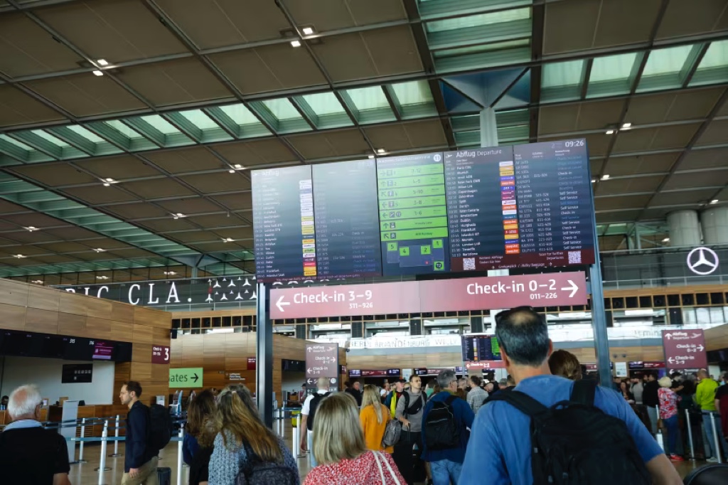 Berlin Brandenburg treo thông báo trên trang chủ: do sự cố tại nhà cung cấp hoạt động trên khắp châu Âu, thời gian chờ check-in kéo dài; sân bay đang tìm giải pháp nhanh.