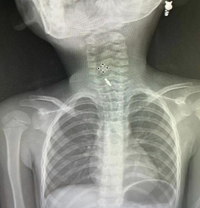 Tại viện sau khi thăm khám và chụp chiếu, hình ảnh chụp phim X-quang cho thấy bệnh nhi có dị vật mắc sâu trong thực quản. Các bác sĩ đã thực hiện nội soi bằng ống cứng và gắp dị vật ra ngoài.