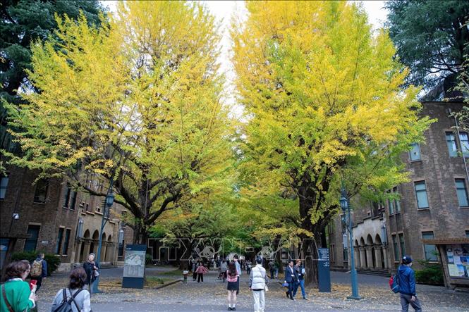 Ký ức không chỉ lưu lại khoảnh khắc ngoạn mục, mà cả những chi tiết tưởng như vụn vặt trước và sau sự kiện. Trong ảnh: Hàng cây ngân hạnh chuyển dần sang màu vàng tại Đại học Tokyo. Ảnh minh họa: Xuân Giao/PV TTXVN tại Nhật Bản.