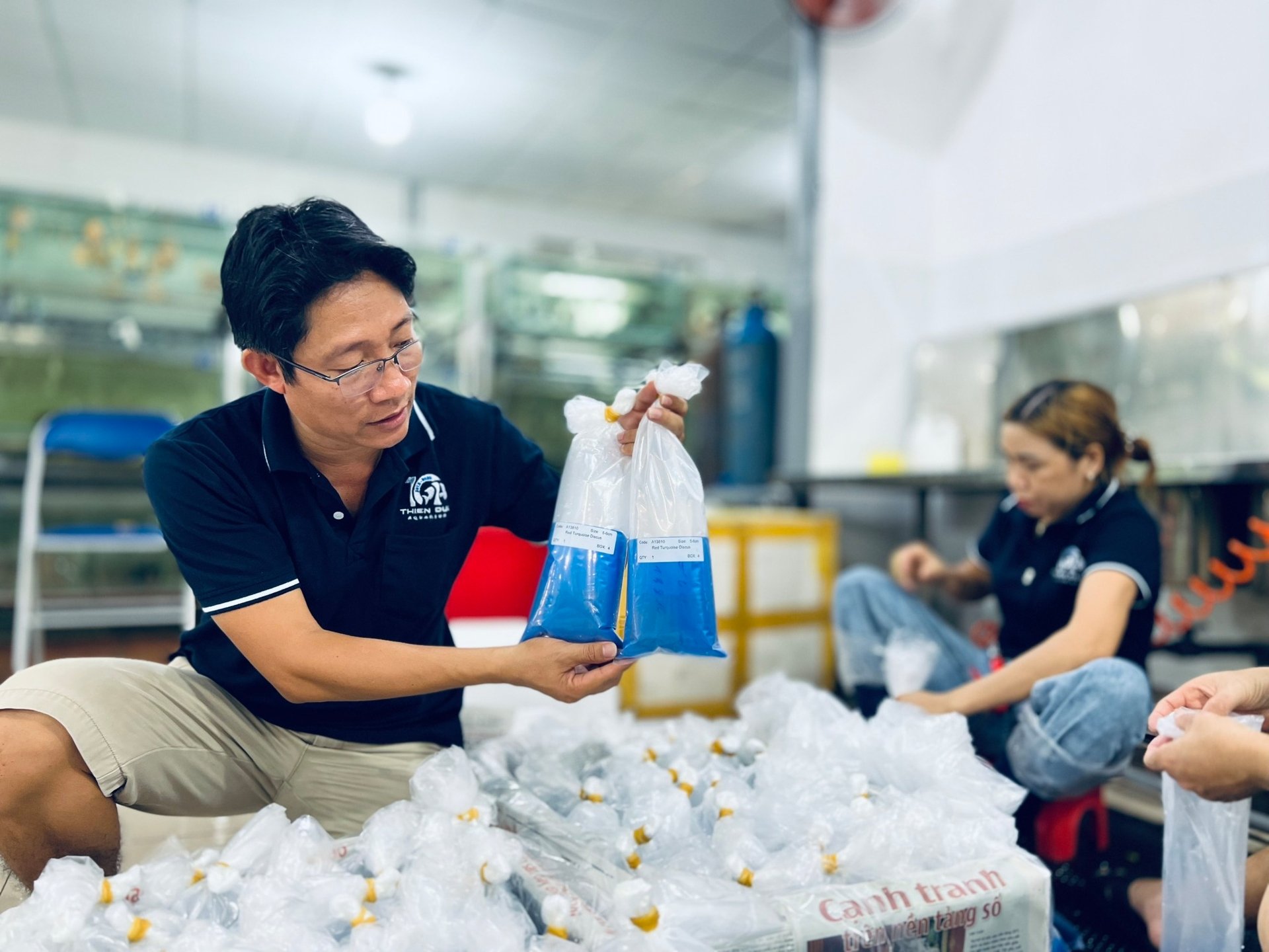 Anh Thiện, chủ trại nuôi cá kiểng xuất khẩu đang chuẩn bị xuất khẩu cá kiểng. Ảnh T.Đ