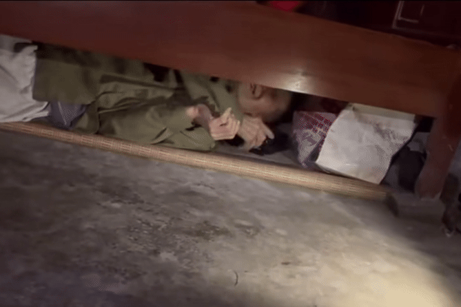 Cụ ông Nghệ An chui xuống gầm giường tối 28/9 để tránh bão. Ảnh cắt từ clip.