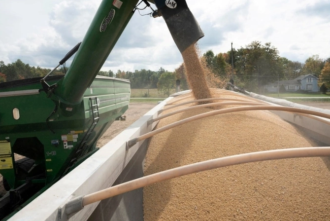 Đậu tương được chất lên xe tải tại Deerfield, Ohio (Mỹ). Ảnh: Reuters