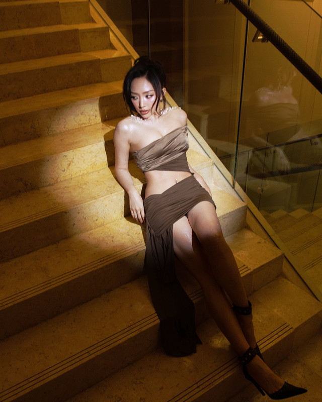 Bộ váy trễ vai lộ ra phần xương quai xanh quyến rũ cùng vòng eo săn chắc không chút mỡ thừa. Bước sang tuổi 36, có thể thấy Tóc Tiên đã luyện tập rất chăm chỉ để có được vóc dáng "căng đét" như hiện tại.