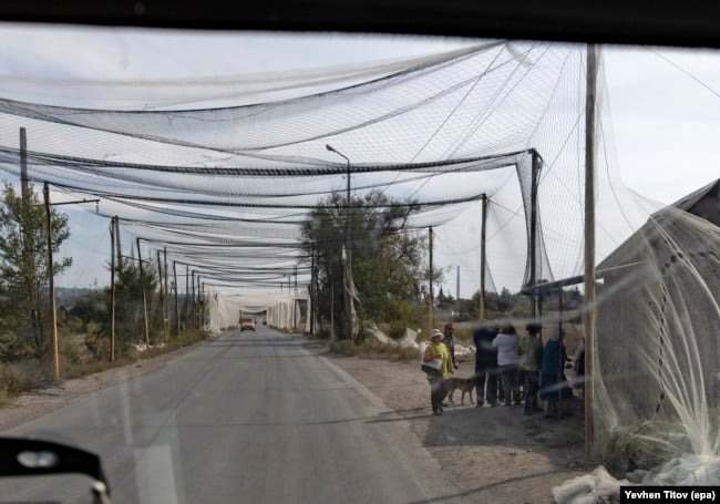 Lưới bao phủ một con đường gần Konstantynivka, miền đông Ukraine, khi người dân địa phương xếp hàng tại một cửa hàng vào ngày 16 tháng 9. Ảnh EPA
