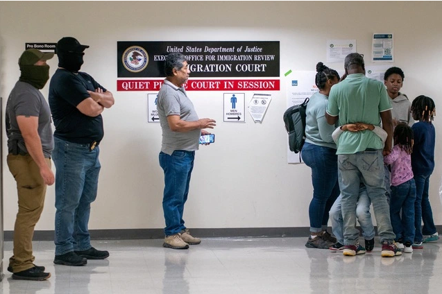 Các nhân viên di trú liên bang (trái) chờ những người tham dự rời đi để thực hiện việc bắt giữ tại một phiên tòa di trú ở New York hôm 7.10