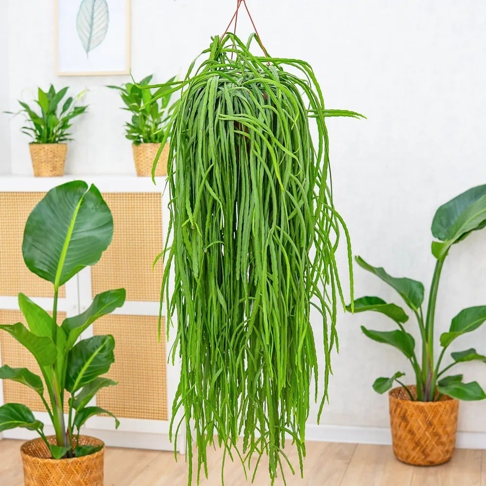 So với các loại cây cảnh trồng trong nhà khác, cây xương rồng tầm gửi này chắc chắn được yêu thích nhất. Cành (khớp thân) của nó dài, rủ xuống tự nhiên, nhiều và rậm rạp, màu xanh đậm, không gai, tựa như thác nước, cũng tựa mái tóc xanh tươi mát.