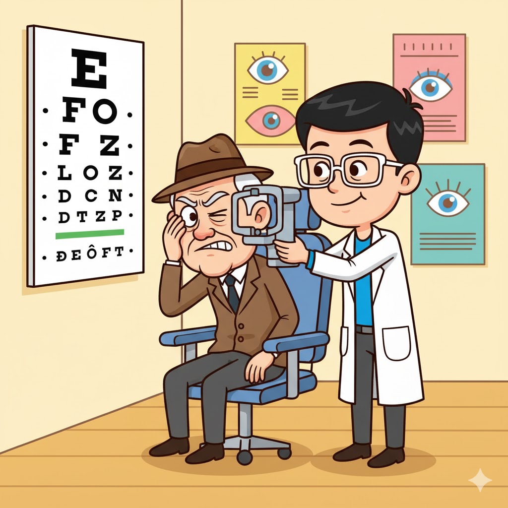 Ông cụ 80 tuổi đi khám mắt, bác sĩ giơ bảng chữ cái và nói: