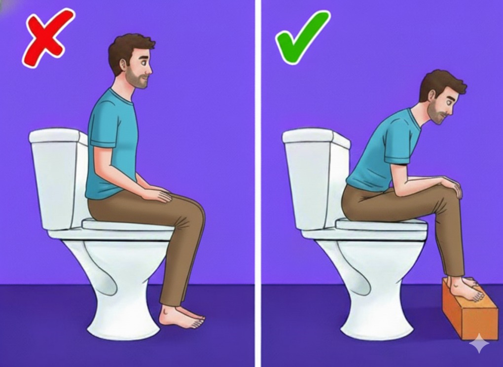 Nên đặt ghế nhỏ dưới chân khi ngồi bồn cầu và nâng cao đầu gối hơn hông để làm thẳng trực tràng, giúp việc đi tiêu trở nên dễ dàng hơn. Ảnh tạo bởi AI