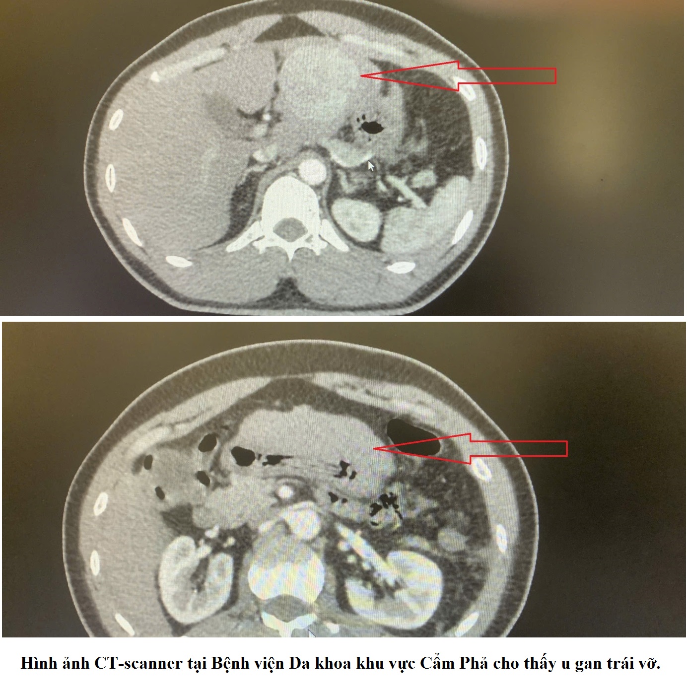 Hình ảnh CT-scaner xác định có khối u gan trái kích thước 58x55mm, ngấm thuốc mạnh, sau tiêm thì động mạch có động mạch đi vào trung tâm khối, có phần bờ mất liên tục, gây chảy máu trong bao lan theo mạc nối nhỏ xuống mặt trước dạ dày (kích thước 23mm) kèm theo có dịch tăng đậm độ dạng máu trong ổ bụng.