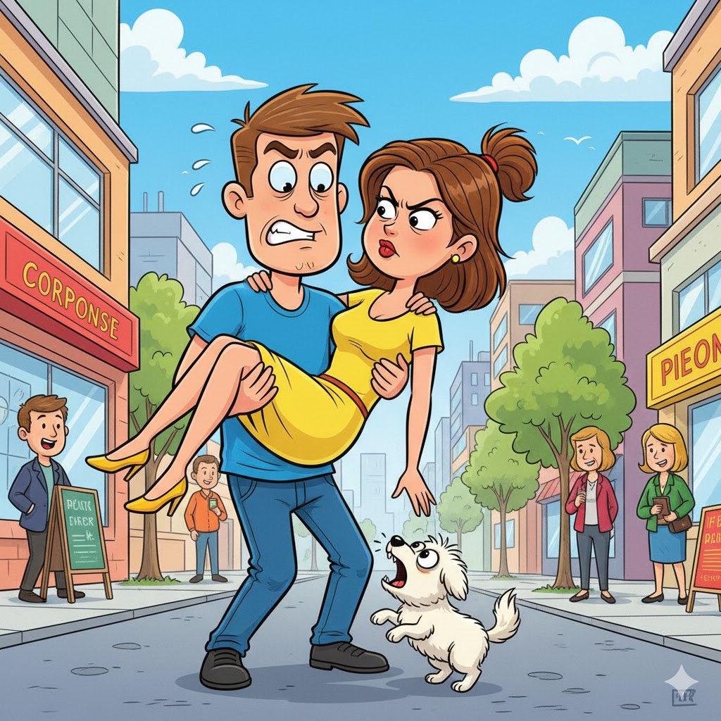 Một đôi vợ chồng trẻ đang dạo phố thì bất ngờ có con chó từ đâu lao tới, định tấn công cả hai.