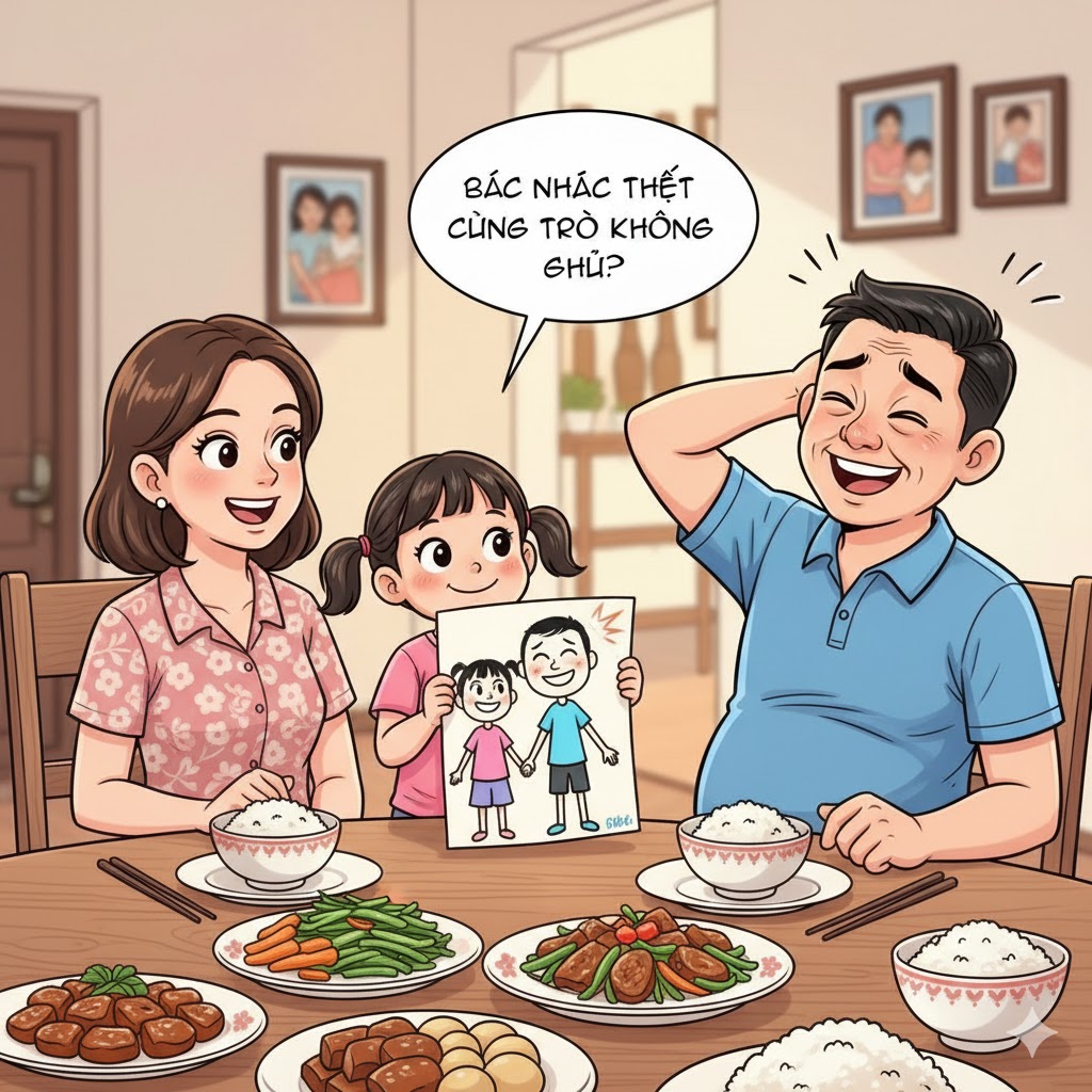 Trong bữa cơm, cô con gái tinh nghịch hỏi: