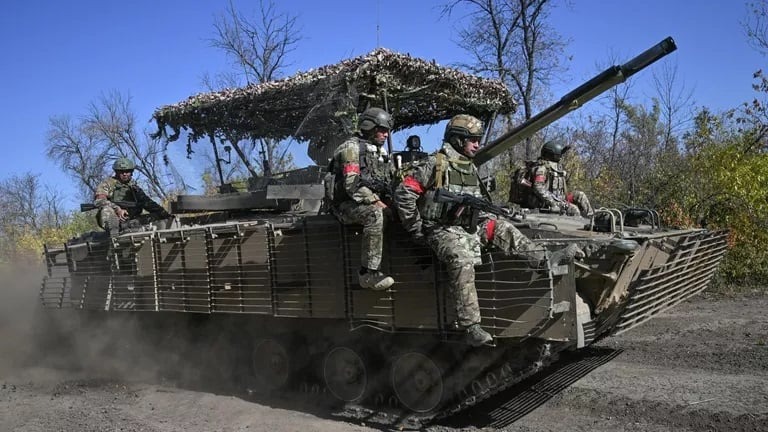 Binh sĩ Nga di chuyển trên xe tăng. Ảnh TASS