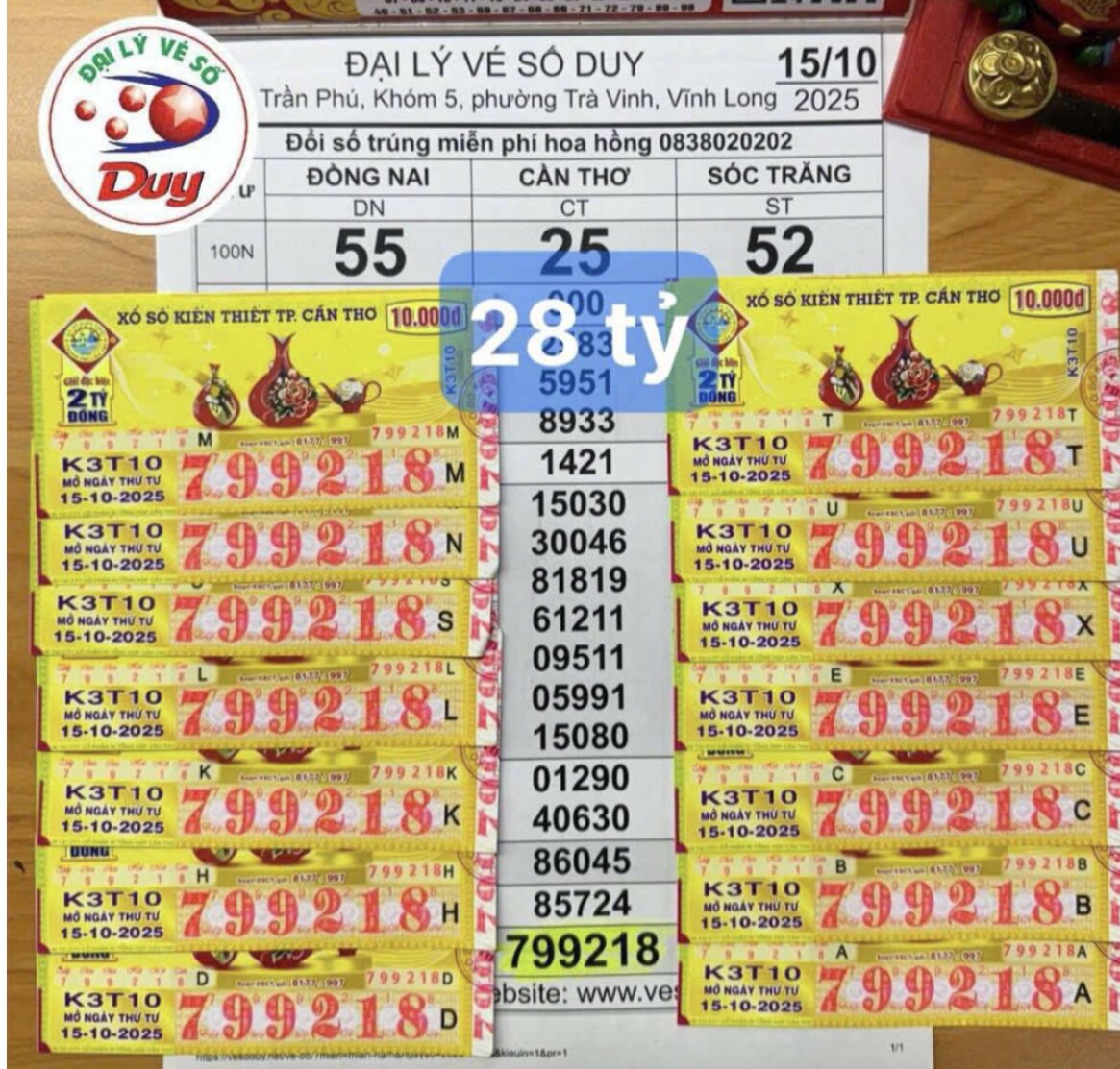 Ngày 16-10, ông Lưu Quốc Duy, chủ đại lý vé số Duy (phường Trà Vinh, tỉnh Vĩnh Long), cho biết đại lý vừa đổi thưởng 14 tờ vé số trúng giải độc đắc cho một nữ khách hàng ở TP Cần Thơ.