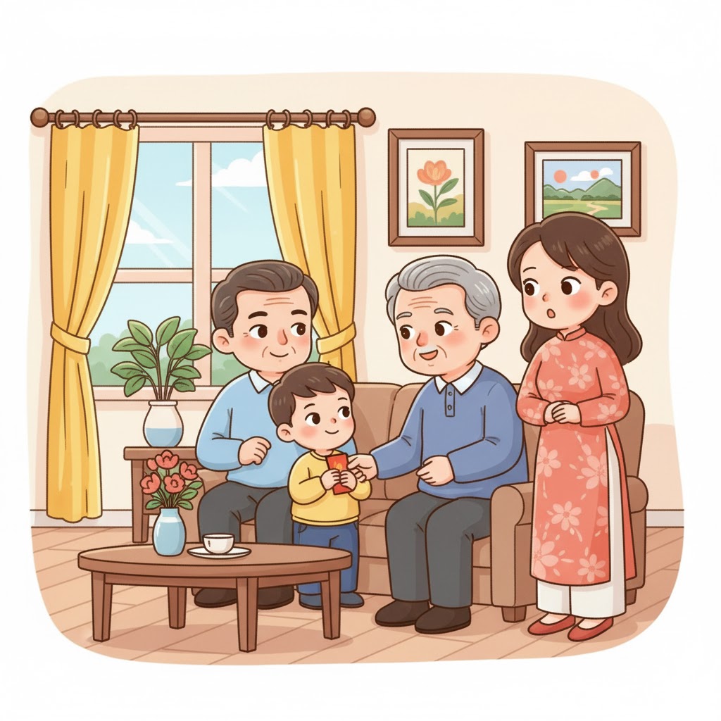 Thấy bé Bi ngoan ngoãn, ông khách khen và thưởng cho Bi 100 nghìn đồng vì thành tích học tập tốt.