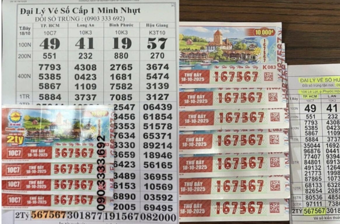 Chủ đại lý vé số cấp 1 Minh Nhựt có chi nhánh chính ở phường Thạnh Mỹ Tây, quận Bình Thạnh (cũ), TP.HCM xác nhận vừa đổi thưởng 4 tờ vé số trúng độc đắc đài TP.HCM, theo kết quả xổ số miền Nam ngày 18/10. Cụ thể, những tờ vé có dãy số may mắn 567567.