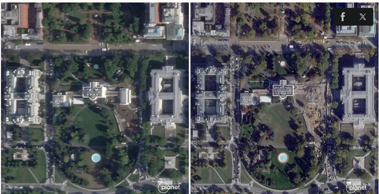 Ảnh vệ tinh cho thấy toàn bộ Cánh Đông của Nhà Trắng đã bị phá dỡ và san phẳng để xây phòng khiêu vũ theo ý tưởng của Tổng thống Trump.